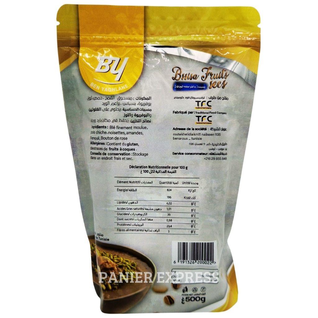 La bssisa aux fruits secs Ben Yaghlan est une préparation traditionnelle tunisienne riche et nutritive. Élaborée à partir de céréales finement moulues et enrichie de fruits secs, elle offre une saveur authentique et une texture onctueuse. Idéale pour un petit-déjeuner énergétique ou une collation saine, elle se prépare facilement avec de l’huile d’olive, du lait ou de l’eau.